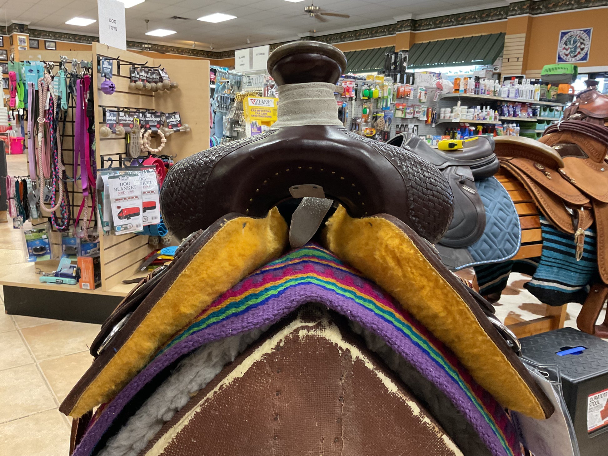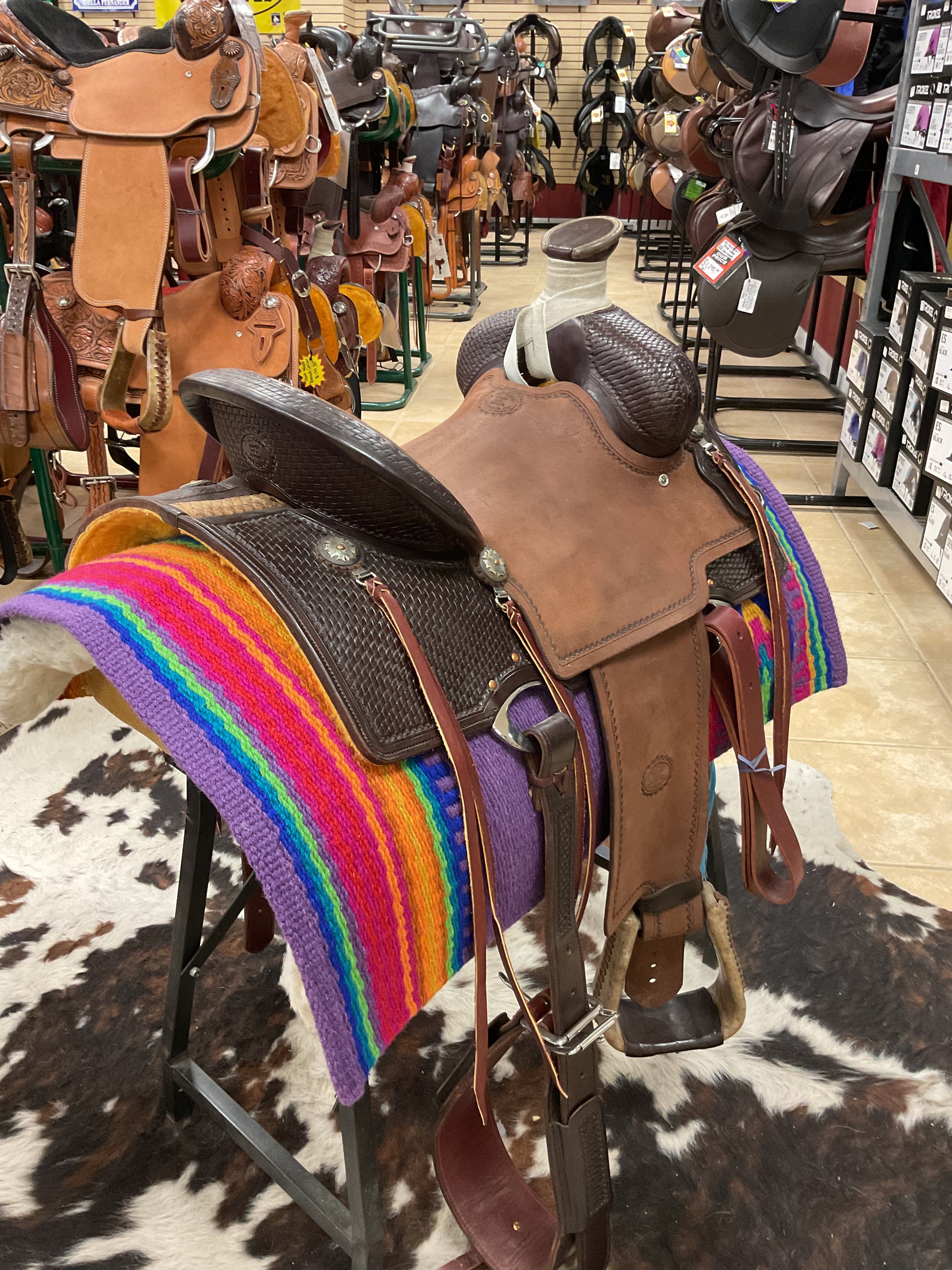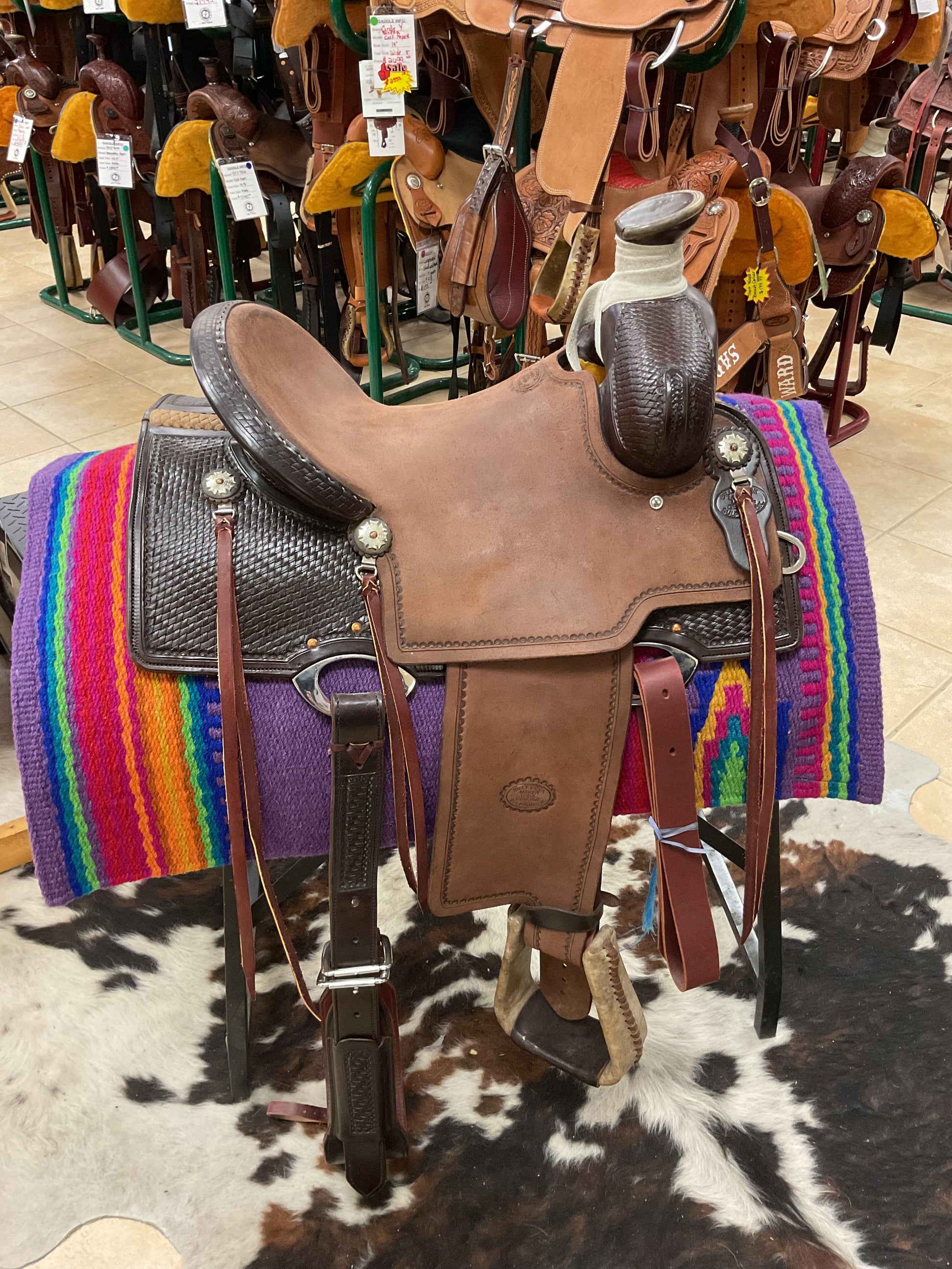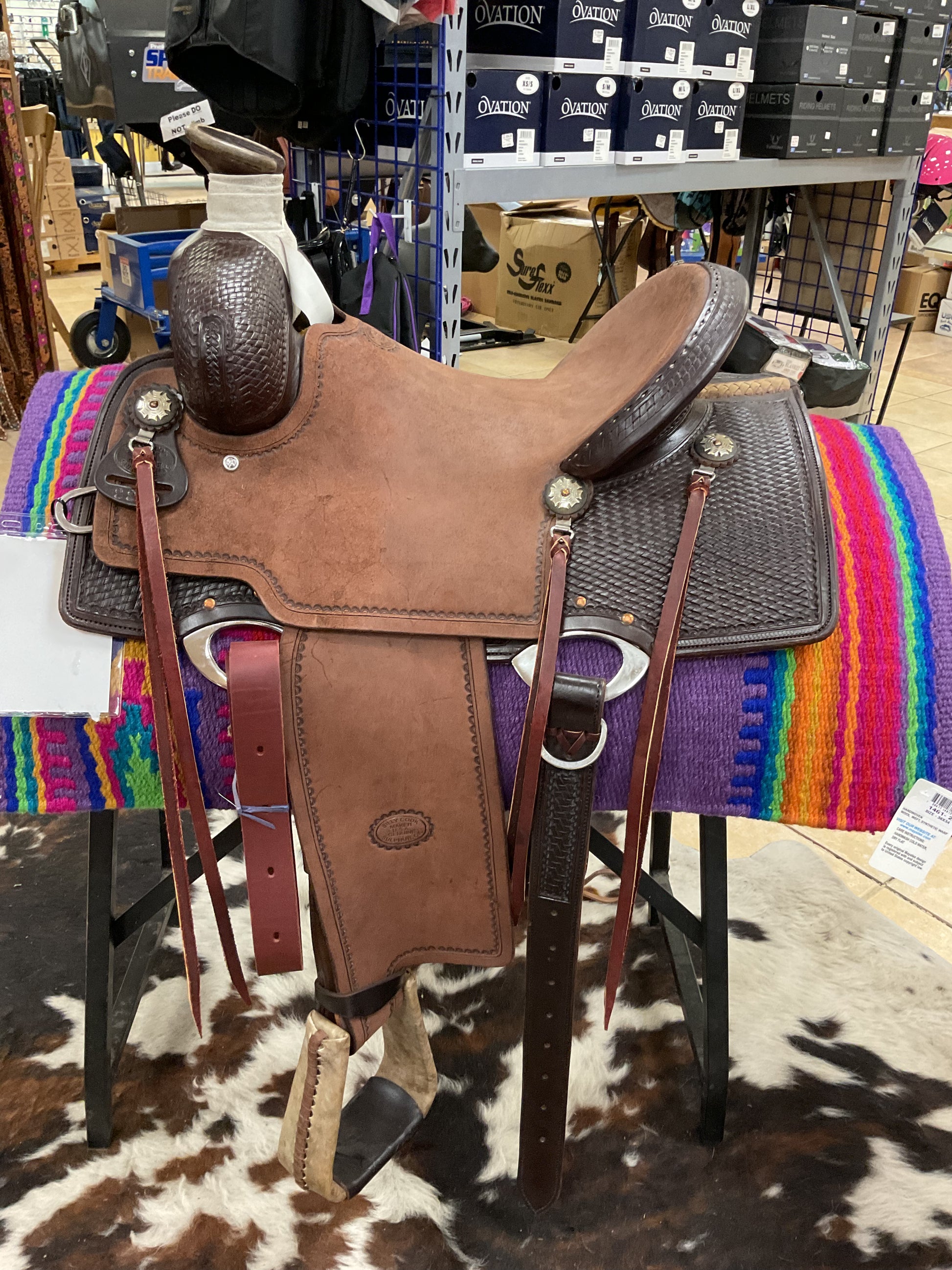 The Red River Rancher saddle boasts the added comfort and stability of a Mother Hubbard Skirt. Its innovative Halfbreed Groove Weave design provides superior support and performance for both horse and rider. Perfect for any equestrian enthusiast looking for a high-quality and reliable saddle.